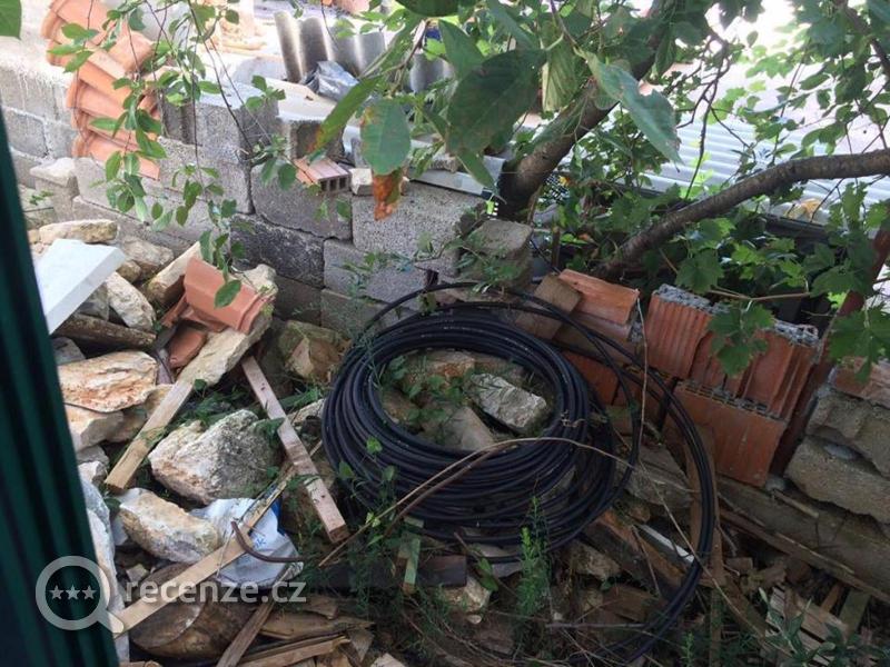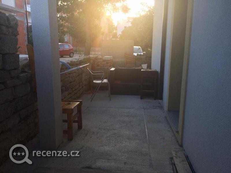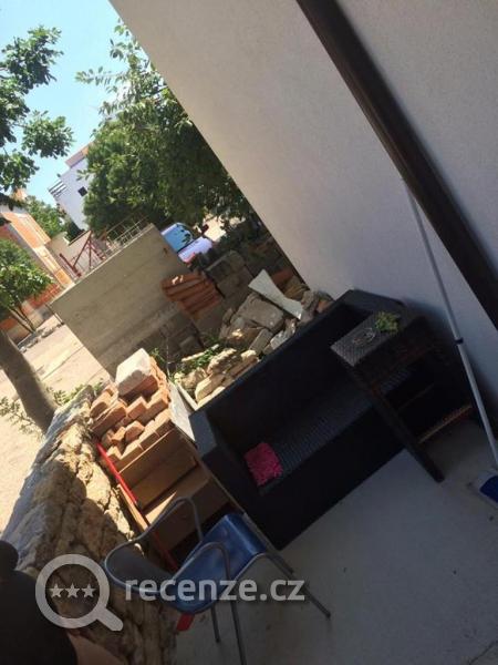 staveniště výhled na cihly, místo balkonu terasa s bordelem, kolem bazénu též cihly, plus bazén ten v Chorvatsku nebývá, ale hodně studený, špatný je suterénní ubytování, zbytek vily je ok