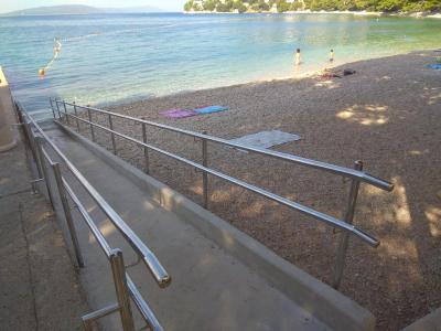 K dispozici je bezbariérový přístup do moře. Pláž oblázková, doporučuji obuv do vody,hlavní pláž celkem bez ježků.