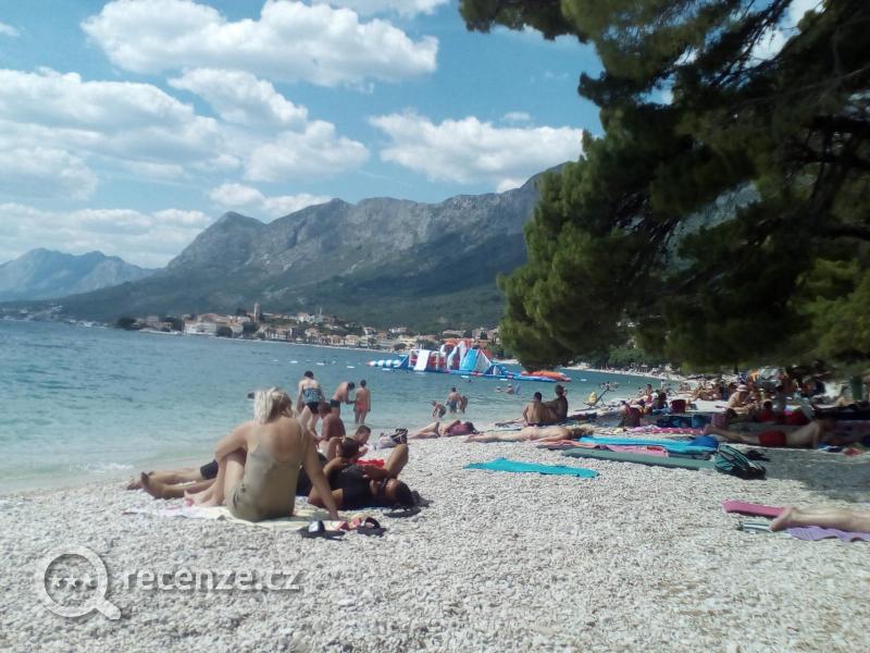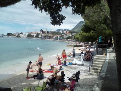Pláž výborná, čistá, oblázková, částečně zastíněná stromy, místy na vstupu do moře i písek. Voda průzračná, na konci června osvěžující. Hotel inzeruje vzdálenost na pláž vzdušnou čarou 50 m, ale je třeba jít nejméně 300 m a sejít k moři po schodech. Lehátka půjčují místní za poplatek. V blízkosti hotelu je na pláži vodní nafukovací atrakce, za poplatek.