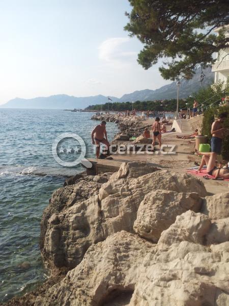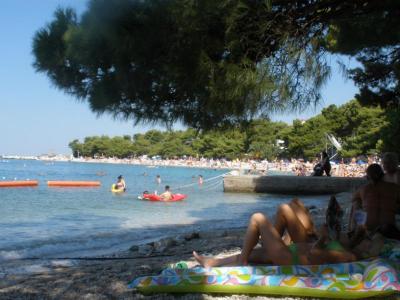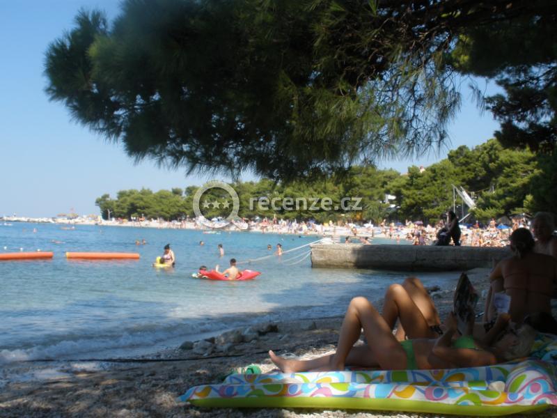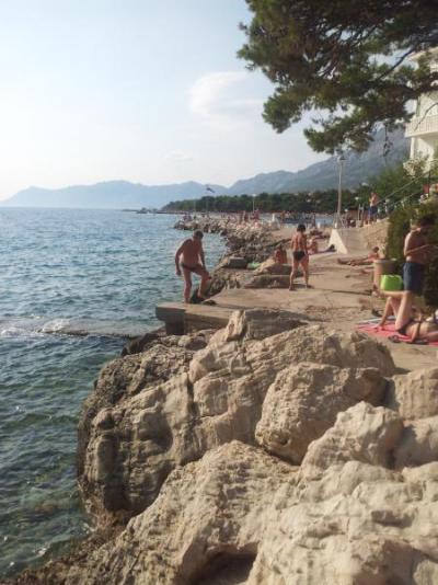 Do 12 dopoledne se dá najít místo jak na hlavní pláži na slunci nebo pod borovicemi, nejvíce se nám libilo na vybetonovaných placech na okraji Promajny směrem k Makarske, kde byl větší klid - horší přístup do vody přes skaliska.