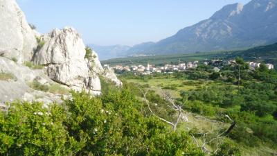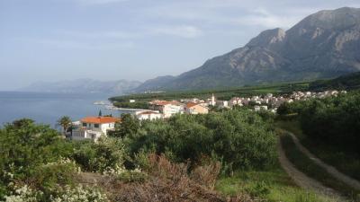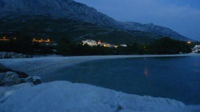 Vzdálenost asi100m, v centru ostré drcené kameny, míchané s ohlazenými, dále k Bašce lepší vstup do vody a více místa. Každé ráno byl uklízený park i pláž. Parádní je, že skoro po celé délce je pláž lemována borovicemi, kde se můžete schovat před sluncem. Všechny sprchy jsou na mince (2 kuna), toalety od 2 do 5 kuna. Voda je zde čistá, 2m od břehu už začínají ježci. Možnost procházek při moři do sousedních letovisek, vzdálených 4 a 6 km. Z poloviny vedou cesty lesem.