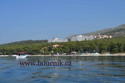 Asi 5 minut chůze po schodech dolů z hotelu. Pláž dlouhá, čistá, spousta placených služeb a krámků se vším možným. Dále sportovní hřiště, kurty. Po pláži lze dojít až do Trogiru, asi 4 km, v závěrečném úseku ale nutno zabočit přes hlavní silnici.