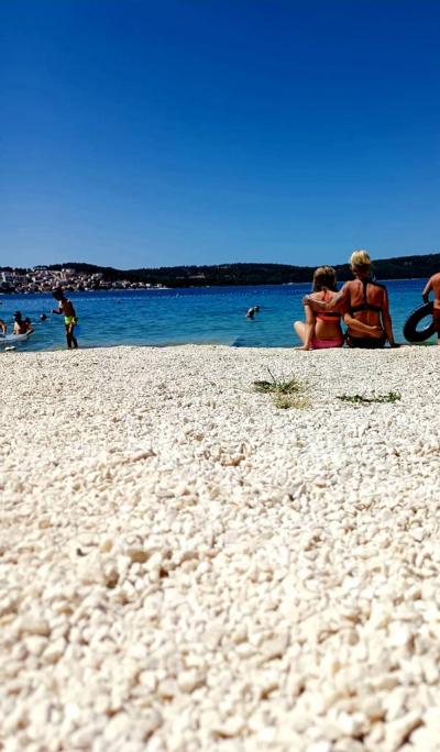 Pláž krásná, v červnu nepřeplněná, moře s pozvolným vstupem. Koupání jsme si užívali. Nutné boty do vody.