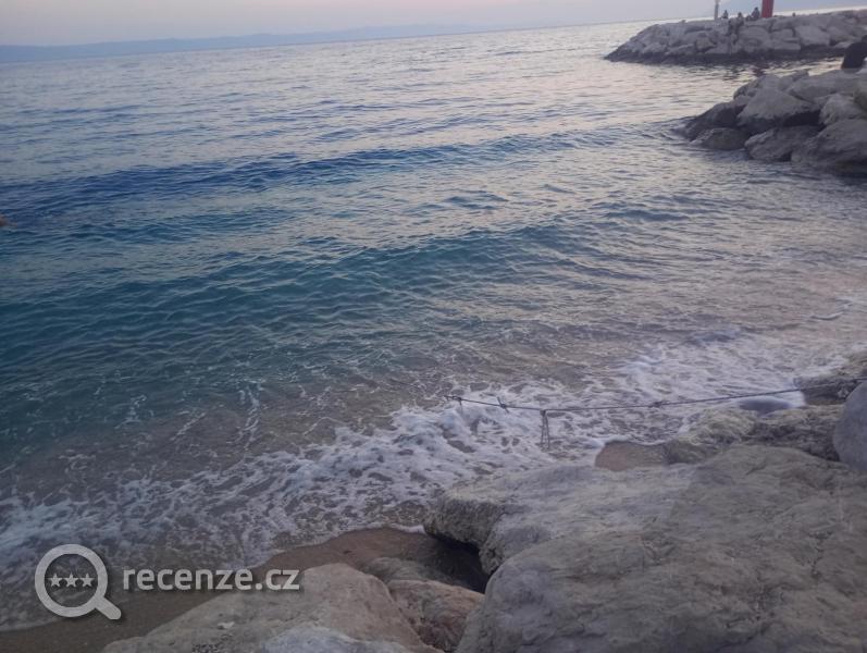 Pláž kamenitá celkem ujde ale vemte si určitě boty do vody tam vzadu nalevo se dají najít i nějaké malé mušličky někde je tam i zmrzlina za 1,50 což je taky dobrý voda čistá k večeru trochu vlny někde je hodně ježků někde zase míň dávejte si pozor radši si jídlo nakupte v pekárně nebo marketu doporučuji masový Burek obědy předražené nekupovala bych pláž je od penzionu tak 5 min ale tam jsou zrovna ježci musíte dál takže posuďte sami