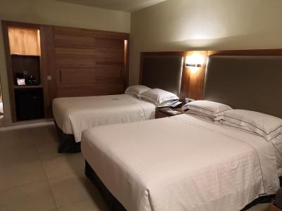 Pokoje nabízí vše potřebné, velké postele i prostor. Samozřejmostí klimatizace, trezor a minibar. Na pokoji se dost srážela vlhkost a podlaha byla po otevření dveří na terasu nebezpečně kluzká. Ráno nás na podlaze čekal šváb, ale byl omámený zřejmě nějakým nátěrem na podlaze. Každý den čisté ručníky, doplněný minibar. Wifi na pokoji 12 USD za den, 20 USD za 2 dny, 120 USD za týden. Další fotografie z pokoje deluxe max. 2+2, část level.