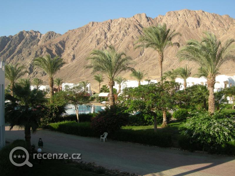 Krásná hradba hor u hotelu, pěkná udržovaná zahrada, hotel na samotě bez lesa:), ale do Dahabu to je kousek, odvoz hotelovým busíkem zdarma.