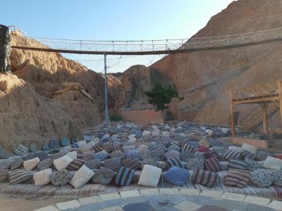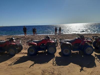 Personál neměl chybu.Recepční nás přivítal,řekl nám číslo pokoje,poslal na snídani.Hned po snídani náramky.A to bez doláčů v pasu.V baru obsluha vysmátá.Číšníci v restauraci super,lítají jako fretky ale vždy s úsměvem a legráckami.Vybavení-doporučuju čtyřkolky se Samem,moje holky 13 a 15 let byly nadšené.Nejdříve je nechal zkusit,jestli to zvládnou samy. Zvládly,koupili jsme šátky v krámku u recepce za 4$.Brýle radši z domova,tam za ně chce 20$.Můžete jezdit buď brzy ráno nebo k večeru.My jsme toho projeli hodně.Za 1 osobu chtěl 20$...většinou se jezdilo 2-2,5 hodiny,doporučuji lagunu,poušť,panorama,pobřeží,beduíny.Do Dahabu na trh jezdí každý den hotelový autobus,stačí se v ten den zapsat do knihy na recepci.V kolik pojedete,počet osob a číslo pokoje.Smlouvat,smlouvat.Ještě jsem zapomněla, v hotelu se dá jezdit na koních,velbloudech...vyvezou vás na projížďku.