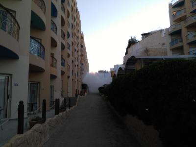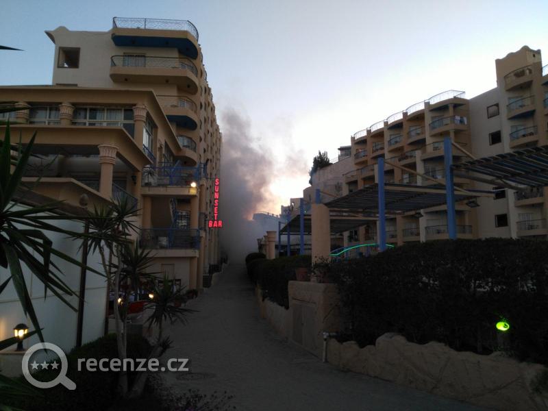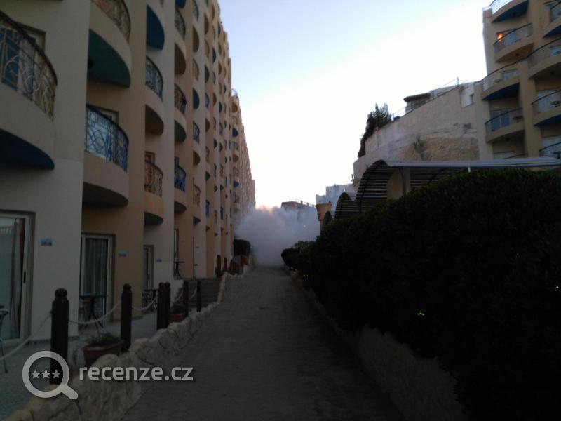 2) Pravidelně cca kolem 18. hodiny docházelo v celém areálu hotelu ke generování dýmu s pesticidy pracovníkem hotelu. Upozorňuji, že to bylo těsně před začátkem večeří (18:30). Cca 1-2hodiny zapáchal po těchto jedech celý areál hotelů a nebylo možné větrat. I přesto byl tento zápach citelně cítit i na pokoji a venkovním prostoru nemluvě. Fotka počátku generování v příloze.