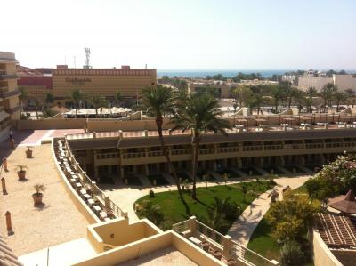 Na recepci jsme Ahmedovi nenápadně šoupli 10 dolarů s tím, že dostaneme lepší pokoj. Dostali jsme pokoj č.6116 v nejvyšším šestém patře. Zařízení v pokoji bylo starší, koupelna trošku narezlejší , ale bylo uklizeno a čisto. Výhled super, koukali jsem na celý náš bazén, viděli jsme i kousek promenády a pak v dáli moře :). Sice jsme neměli v pokoji tv-plazmu ( dočetla jsem se u jiných recenzí, že někde na pokojích byla), ale fakt nám tohle žíly netrhalo. Ale díky bohu za 6-té patro, sice to trošičku trvalo na ten pokoj dojít, ale dostat pokoj v přízemí, tak se zblázním. Za prvé milion ubytovaných s dětmi, kočárky , takže neustálý řev :) a za druhé, se na promenádu chodilo kolem bazénu, tudíž kolem přízemních pokojů, což znamená, že musíte mít neustále zatažené závěsy, je tam dost komárů, a když si sednete na terasu, tak čučíte na milion lidí, kteří procházejí.