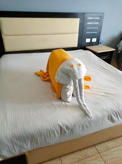 Pokoj slušně vybavený - malá koupelna se sprchovým koutem, manželská postel, 2 křesla, TV, trezor, mini lednička i s mrazáčkem, varná konvice, pitná voda doplňovaná denně, ... - Úklid byl prováděn denně, stejně tak výměna osušek a ručníků.