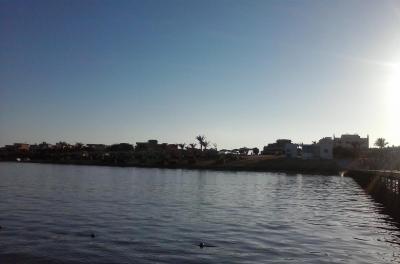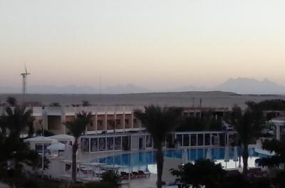 Hotel je v podstatě odříznutý od světa, vedle je ještě jeden hotel a pak už nic. Z druhé strany se staví nový hotel ve stylu Flinstoenů. Z pokojů je boční výhled na moře a do pouště, kde jsou větrné elektrárny a v dáli hory - zajímavý pohled. Cca 45 min od letiště, 30 min autem do centra Hurghady.