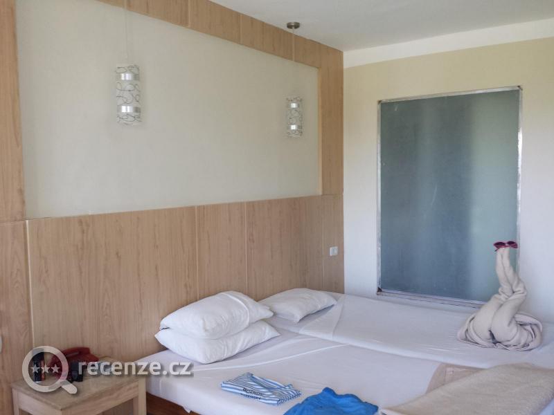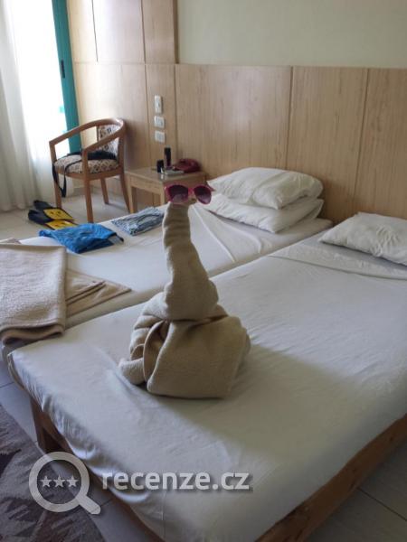 Pokoj jsme měli situován směrem na moře (nádherný výhled), pokoj měl typické vybavení televize, klima, lednička, dvojpostel, koupelna čistá a vše funkční i studená voda a každý pokoj měl trezor. Každý den jste mohli využívat úklidu pokoje, vždy čisté a krásně ustlané - za bakšiš z dek vytvořené labutě nebo krokodýl.