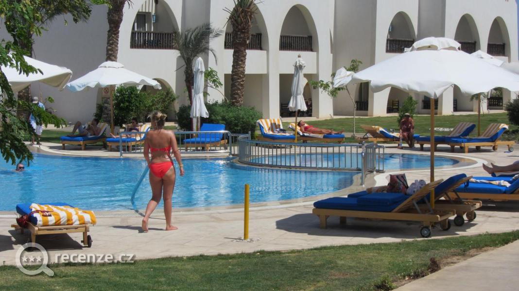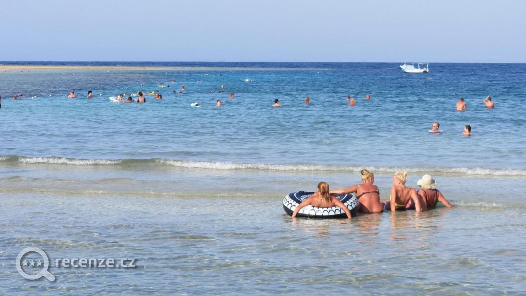 Pláž je kousek procházkou nebo vláčkem. Je tam bar i WC. Obchůdky, sprchy, plno lehátek. Do vody se musí obejít zátoka, ale stojí to za to. 1,5 hodiny šnorchlování uteče jako nic. Je to fakt jako plavání v akváriu. Voda měla cca 33stC. Jako kafe. Vzduch celé 2 týdny 35-37stC. Ani mráček!! Před 10.h dopoledne přijíždějí na pláž busy z okolních hotelů s lidmi na korály. Takže v tu dobu bývá víc lidí. Ve 12 odjedou a ve vodě téměř nikdo. Jen plno ryb, želvy, rejnoci atd.