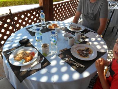 Výběr jídla dostačující, až na ty ryby- po pár dnech už jsme white fish nemohli ani cítit. Nicméně přímo v restauraci u bufetu vařil italský kuchař penne, špagety a omáčky. Těch jsme se tam přejedli, jelikož jeho těstoviny byly výborné. Ráno u nás vedly palačinky. Faraon se nám bohužel nevyhl. Ať ve formě lehčí, nebo horší, kdy jsme museli do hotelové lékárny (prášky 21dolarů, ale české nezabírají). Přisuzuji to ale tomu, že náš žaludek prostě nesnesl tolik druhů jídla najednou. Vodu bylo možné doplnit všude z dostupných barelů. Jedním z plusů bylo výborné mochito. Další podobné drinky také ok, ale bylo tam zbytečně mnoho alkoholu, což se zde prý dělá. Stravovali jsme se pouze v restauraci- snídaně, oběd, večeře, ale u dalších hlavních barů byly i nějaké snacky a zmrzlina. Po příjezdu pásky na ruce, které odlišovali all inclusive italů (bez alkoholu- žlutá) a ostatních (s alkoholem- modrá), alespoň takto nám to bylo řečeno.