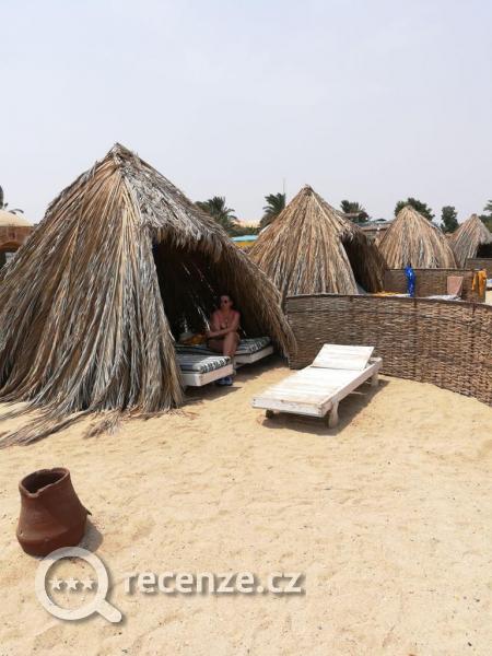 Na pláži i u bazénu si denně vyzvednete čisté osušky, matraci na lehátko automaticky přinesou, až si vyberete místo na ležení. Místa je dost. Chýše z palmových listů - super.