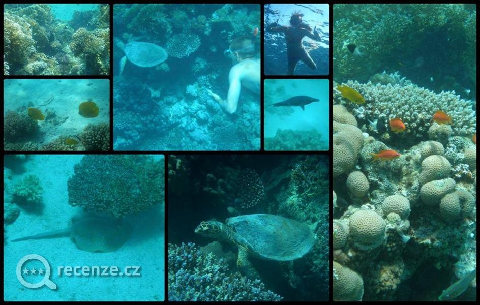 Molo stále nebylo dostavěné. Pláž u hotelu byla tak akorát pro dětičky, kteří se bojí hloubky. Jednou, kdy nebyly vlny, tak jsme šli 300m podél našeho mola k utesu. Což je ale dost nebezpečné, protože když se snažíte vylézt z té 4m hloubky, tak vás vlny házejí na břeh a tak se snadno muzete odřít či jinak poranit. My jsme s přítelem chodili doleva asi tak 600m, kde byla pěkná laguna. Já jsem tam viděla velkého rejnoka :). Ale bohužel to bylo dost zakalené, a tak fotky z toho nic moc. Dále se dalo jít tak dva km doprava, na druhé molo. Jedno bylo placené a to za tim bylo normálně přístupné. Jakmile se tam ale dostanete, plavte na levou stranu. Pravá je hodně zakalená. V pondělí a čtvrtek se jezdí na pláž Abu Dabbab, kde je to super. Nepotřebujete vůbec boty do vody, je to písčité a určitě uvidíte velké želvy.