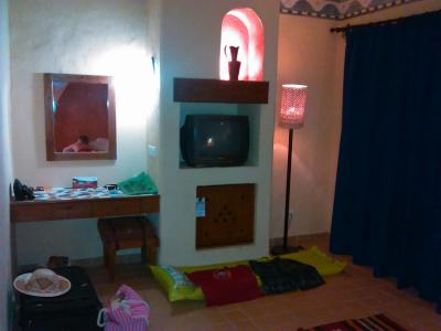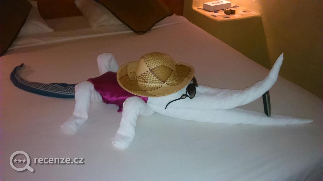 Hotel klame svou rozlohou, na první pohled vypadá, že je maličký, ale ve skutečnosti je větší. Například Utopia Beach je obrovský komplex, ale s tím se to nedá vůbec srovnávat. Komu vyhovuje menší hotel, bude rozhodně spokojený. Jsou tu tři bazény, které jsou šikovně umístěné pod sebou. Při příjezdu flaška vody na hlavu, poté jsme ji nabírali z barelu, který byl k dispozici u bazénového baru nebo v jídelně. Pokoj jsme dostali s výhledem na bazén. Vybavení klasika: klimatizace, sejf, velká postel, televize, gaučík, sprcha a minibar sice za poplatek (plechovky coly, fanty a spritu), ale i tak jsme do něj strkali vodu. První den se nám přišli představit zaměstnanci hotelu a donesli nám talíř s ovocem a župany. Také nám udělali žraloka z ručníků. :)