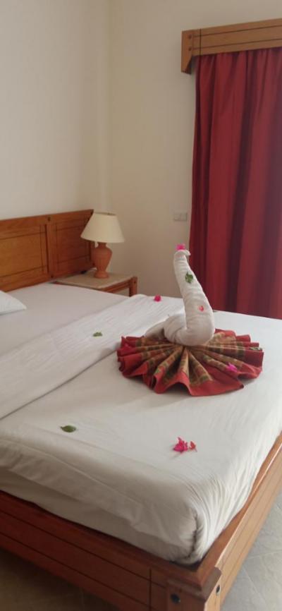 nízký komplex v rozlehlé zahradě, plný zeleně, mimo město ,,takže klid, docházková vzdálenost k zátoce se želvami, kousek od přístavu Port Ghalib, ubytování starší ale funkční, celodenní úklid ve všech prostorách, každý den poctivý úklid pokoje s různými postavičkami z ručníků, na každém kroku záchody, které byly dokonale udržované