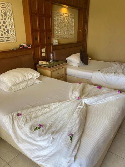 Tento hotel jsme vybirali ze strategické polohy , k cestě do Jordánska a Israele. Po nočním příletu a malém všimném jsme dostali super pokoj hned v prvním bloku a hned u restaurací a bazénů . Prní den ráno jsem si oběhla celý hotel a zjistila že tento hotel má dvě restaurace což nám nikdo neřekl , ale snad to někomu pomuže do té hlavní chodí hlavně mistní a z okolních státu . A proto je lepši chodit hned naproti do krásné restaurace kde máte klid a v pohodě se najite . Dokonce jsme mněli super číšnika Ahmeda který nám nosil tašky a ubrousky abychom si mohly vzít zákusky na pokoj a daly si je jako pozdní svačinku což bylo super , jidlo za mně tedy nejlepší v Egyptě opravdu velmi dochucené jidlo plno rýže a hovězího a ryb málo egyptského červeného jidla za mně top zakusky. Ted pokoj dostali jsme krasný velký prostorný , pan uklizeč denne vse dopnoval až jsme mněli i přebytky které jsme vrátili nebot nepovezu domu tunu balené vody kavy a sprcháčů. Každý den kytky na posteli pan uklizeč velice ochotný jmenoval se Fanah. Čislo pokoje 2167 . Bazény užasné velké nikdy jsme se tam nemlátili s otatními vždy jsme chodili spiš ke slanému neboť tam bylo min lidi a větší klid . Moře pro šnorchlování dostačující jen nečekejte Marsha Alam korál je spiš mrtvý ale rybiček spousta byli jsme i na 400m vzdáleném korálovém utesu a též dostačujicí ale ne wau!!! Mněstečko nad hotely super stoji tam za to si zajed podívat potřebovala jsem kapky do nosu a cena mně zarazila 1 dolar u nas tak 140 korun velice ochotní v lekárně i když jsme neumněli anglicky pomocí překladače hned nás ochotně obsloužili. Tak to asi bude vše