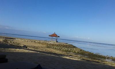 Pláž je jediné trochu slabší místo - celkově na Bali není moc "koupacích" pláží - u tohoto hotelu je pláž se světlým pískem, voda čisťounká, ale je v ní hodně mořských řas, na plavání to není, ale na osvěžení příjemné. tu vlny na rozdíl od jiných pláží (třeba v Kutě). Je tu hodně nabídek na vodní atrakce - parasailing, "banány" vodní skútry...proto jsou místa určená ke koupání ohrazená bójkami a je tu pořád ve vzduchu trochu cítit nafta z těch lodí a skútrů.