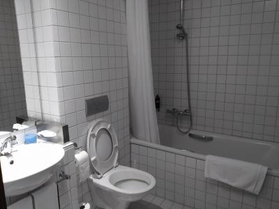 Koupelna s toaletou v jednom, trochu menší umyvadlo s minimální odkládací plochou a vana s kompletním sprch.závěsem a protiskluzovou podložkou (poprvé v cca 55 hotelích).