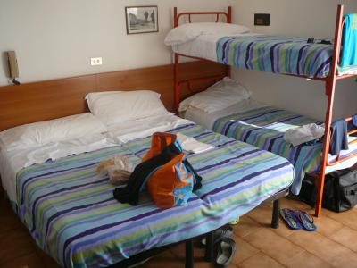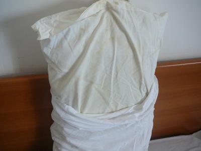Výhrady mám především k velikosti pokoje - cca 16 m2, který byl vybaven pro ubytování 2 dospělých + 2 dětí na přistýlkách. Pokoj byl nábytkem zaplněn natolik, že nebylo možné plnohodnotně otevřít vstupní dveře - viz. foto. Ani čistota lůžkovin nevytváří dobrý pohled na kvalitu ubytování - viz. foto.