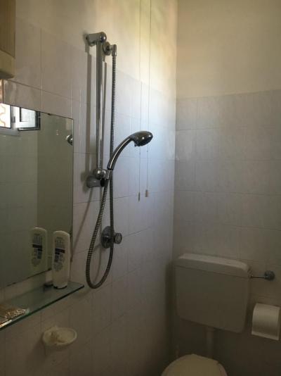 Koupelna: chybí sprcha jako taková. Na zdi je upevněna sprchová hadice, v též samé místnosti velikosti 1,5x2 wc, bidet, umyvadlo. Když se někomu zachce na wc v době, když se druhý sprchuje, má smůlu, anebo může rovnou sfouknout dvě věci najednou. Absolutně nepraktické, vše ihned mokré. Dveře do “koupelny” jsme raději nezavírali, aby neupadli. Hygiena? Tuto položku vynecháme. Moje první cesta vedla do obchodu pro čisticí prostředky a sprchování pouze v obuvi.