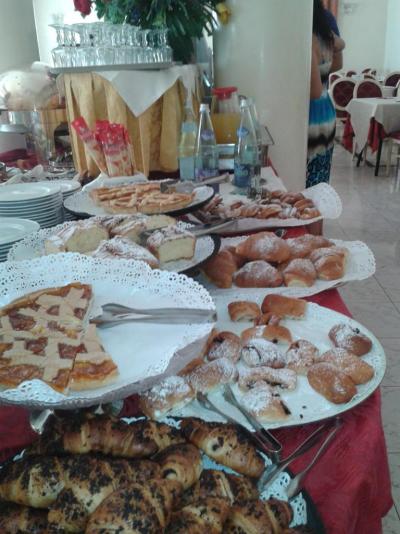 V ceně jsme mněly pouze snídaně. (jdají se přikoupot obědy i večeře). První den byla strava velice dobrá. Ale na druhý, třetí, čtvrtý den už nás štvala, protože se neustále opakovala. Občas něco jiného ale pořád dokola to same: pečivo (např. kroasany, šátečky a ruzné druhy jídla z listového těsta, nechyběl ani toust který se dal opéct) šunka, sýr, salám, okurky, rajčata, vajíčka, ovoce, ruzné druhy lupínků, jogurt (2 duhy), med, marmeláda, nutelka, cukr. Pití: džusy (2 na výběr) velký automat na kávu a na kakao na čaj, mléko. Byly jsme jednou na obědě, nic moc, nemněly jsme ponětí jak to tam chodí a tak jsme si nabýrali jako ostatní ze švédských stolů, švédské stoly na obědě nedoplňují, potom nám jedna z číšniček ukázala jídelníček a my jsme zjistily že máme na výběr 3 hlavní chody, a také dezerty. Po sklamáni na obědu už jsme nešly radši na večeři. Mnohem lepší je zajít v okolí hotelu na pizzu nebo na nějáke ty jejich potvory z moře. Ale poprvé jak jsme jedly v restauraci tak nás překvapil účet na kterém bylo napsáno "COPERTO" nemněly jsme ponětí co to je ale nakonec nám číšník vysvětlil že "coperto" je u nich zvykem (za osobu 2 euro) - (byli jsme 2x v itálii a ještě jsme se s tím nesetkaly) ale pokuď si najdete restauraci která je bez "coperta" tak se dobře najíte ale v jiném prostředí. My jsme to řešily tak že jsme koupily jídlo a snědly jsme si ho před hotelem kde se velice dobře sedí.