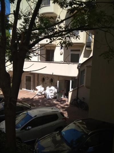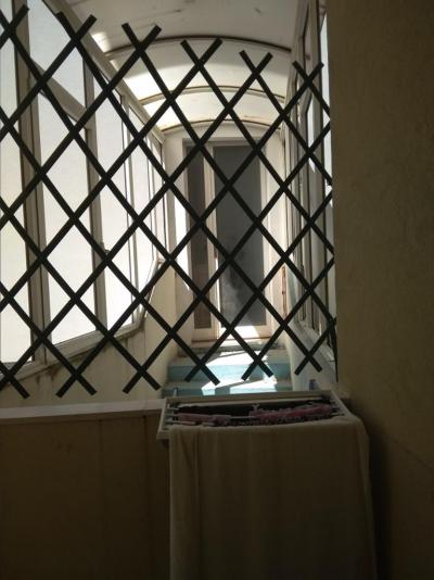 výhled z okna na hotelovou prádelnu jiného hotelu a druhý výhled ze špinavého balkónu na zavřený hotel a odpadkové koše...