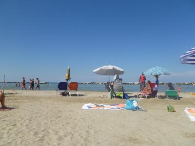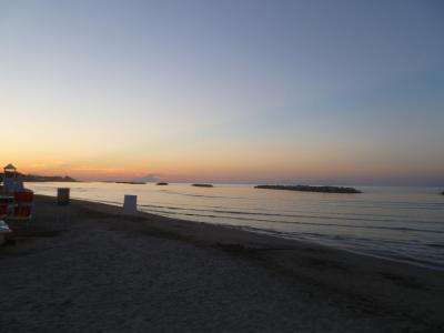 Placená pláž hned před hotelem. Čistá s lehátkami a slunečníky. Zde při odlivu dojdete k vlnolamům skoro suchou nohou. Veřejná pláž menčí tak 50m od hotelu, čistá nepřelidněná, vetší veřejná pláž asi 150m. Moře docela čisté, teplé ale hrozně mělké. Větší hloubka je u kraje vlnolamů nebo mezi nimi.