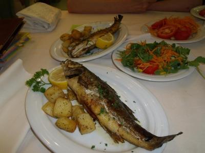 Večeře výběr z menu den dopředu při večeři. Většina ubytovaných byly Italové, při příchodu na večeři si každý naložil hromadu zeleniny, polil oliváčem , octem atd. a snědl s houskou. Následoval předkrm - těstoviny - pokaždé jiné /Italové jedí s houskou), co jsme si vybrali, nebo polévka, rizoto atd. Výtečné. Už po tomto chodu jsme byli plní a spokojení. Následoval hlavní chod - většinou ryba nebo telecí, párkrát jsme si vybrali vepřové.