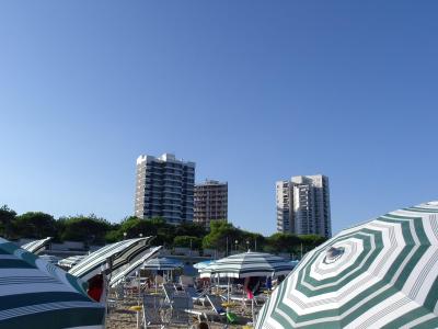 Moře bylo po ochlazení studenější, po bouřce bylo taky špinavé, zkalené, chaluhy, pláž pozvolná písčitá. Pro děti ideální, vzali jsme hodně kyblíků a autíček. Plážový servis v ceně - slunečník, lehátko, křesílko, toto jsme měli od soboty do pátku, v den odjezdu již slunečník není. Přemýšleli jsme zaplatit si ho, ale cena 16 E / den nás odradila (tato cena je nejnižší), čím blíž k moři tím dražší.