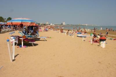 Moře a pláž jsou písčité, pozvolný vstup do vody, pro děti ideální. Chcete-li slunečník, jsou na plážích všude, jen si ho musíte pronajmout-zaplatit. Vlastní si přinést možné není. Podél vody je vyhrazený široký pruh pro ty, kteří slunečník nechtějí. Výhodné, pokud děti sami běhají do vody a chcete je mít přímo na očích. Vstup jako takový se na pláž neplatí, na všech branách je možnost koupit si občerstvení, houpačky pro děti, WC, sprchy, přebalovací místnosti, šatničky, a pominu-li všudypřítomný písek, vše je čisté, příjemné, pěkné. Při přílivu si krásně zaplavete, při odlivu je „moře prostoru“ pro stavění hradů z písku.