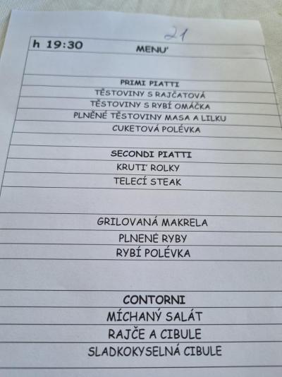 Vyber z jídelníčku v češtině:predkrm výběr ze 4 druhů testovin, hl.jidlo výběr maso nebo různé druhy ryb, salat chléb dezert, vše chutné, měli jsme všeho dost. Přijatelná cena pití a kávy .
