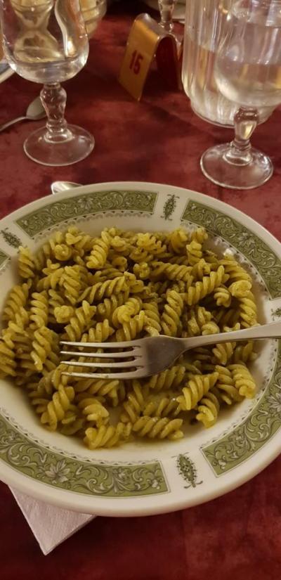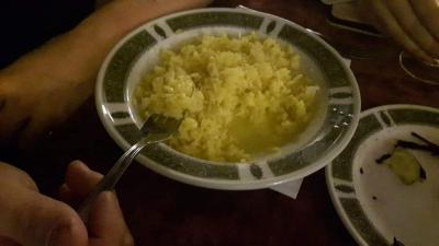 Cestovka avizuje při volbě polopenze večeře s výběrem z teplých předkrmů a ze tří hlavních chodů, servírované dezerty, ovoce a sýry. Ve skutečnosti jsme v jídelně dostali pouze studenou zeleninu a pečivo jako předkrm, druhým chodem byly každý den těstoviny polité olivovým olejem s oreganem, jako bezlepkovou stravu dostal manžel rýži politou olivovým olejem. Třetím chodem byl plátek vepřového či kuřecího masa rozklepaného na cca 1milimetr o velikosti dlaně a k tomu jedna na plátky nakrájená opečená brambora. Jako dezert servírují každodenně puding (jednou hnědý, žlutý pak růžový..) Vynikající odtučňovací kůra!!! Na celou jídelnu huláká vedoucí zájezdu pubescentů z ciziny a udílí denní rozkazy, káže něco o reputaci své země v cizině, aby následně skupina nejméně 80 dětí ve věku 13-17 let bujaře "pařila" do jedné hodiny v noci. A pokud je nedej Bůh napomenete, tak Vám naháží ledové koule se psími výkaly na balkón. No budete vděčni, pokud Vám nepropíchají pneumatiky od auta!!!
