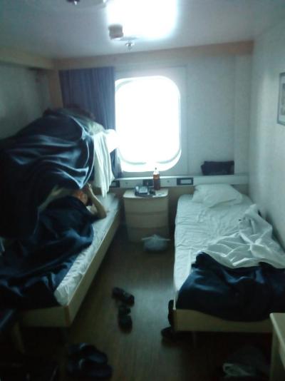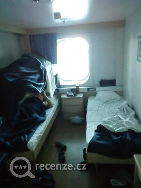 Tří lůžková venkovní kabina s oknem. Kabina...no jako na lodi. Jedno lůžko samostatně,dvě lůžka jako palanda. Skříňka,toaletní stolek,WC a sprcha v kajutě. Sprcha je opravdu malá,ale dá se tam vysprchovat. Ručníky,mýdlo a šampon v ceně trajektu.