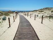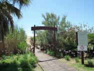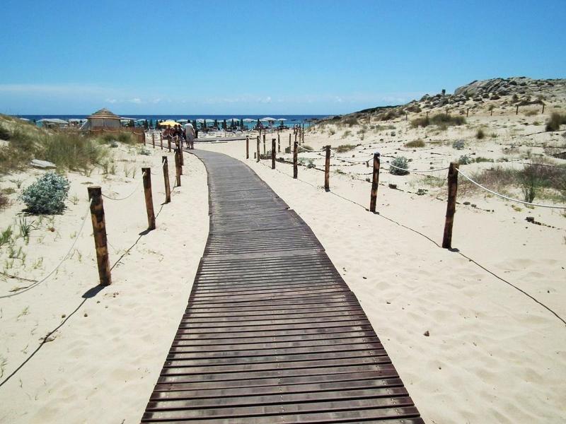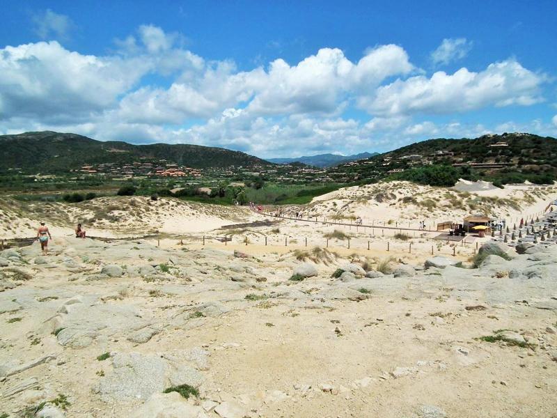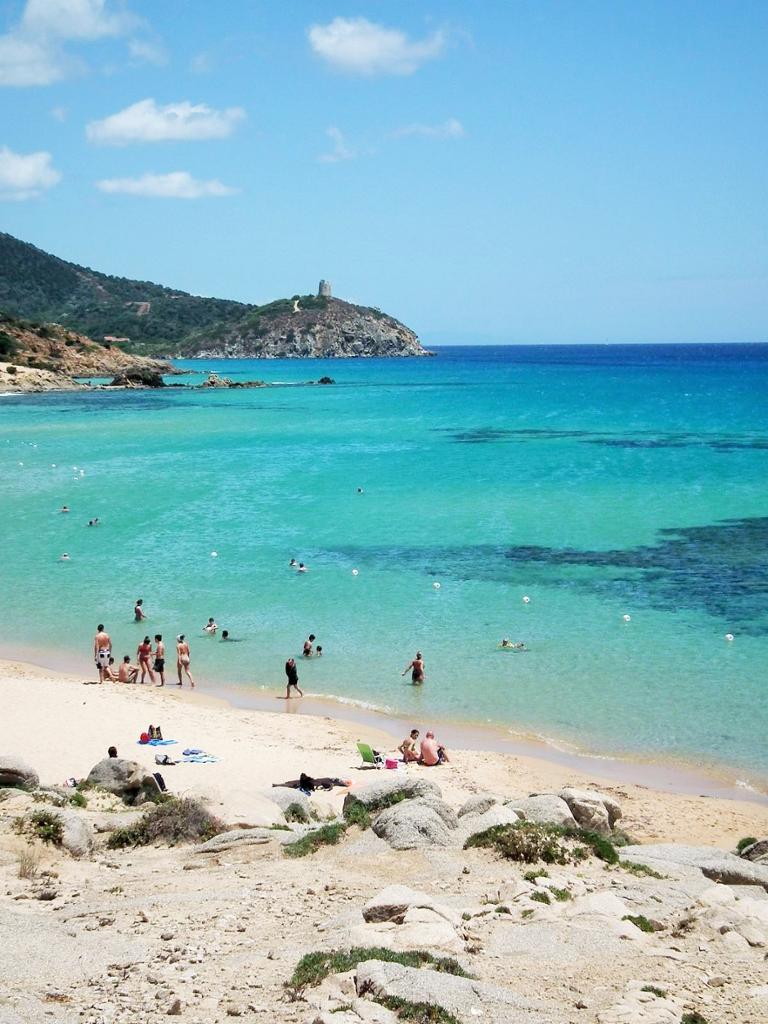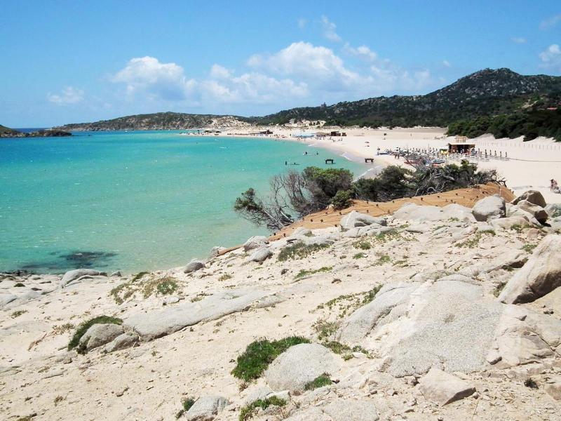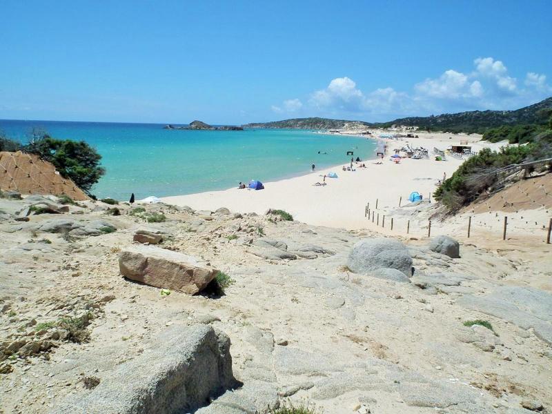 Pláže Chia patří mezi nejkrásnější pláže Středomoří. Jsou zde bílé písečné duny, křišťálově čistá voda, široká písečná pláž. Pláž je asi 700-800 m od komplexu. Na pláž rezervovanou pro klienty hotelu Chia Laguna - Dune di Campana jezdí od hotelu zdarma vláček po celý den. Lehátka a slunečníky na pláži jsou, přičemž 1. a 2. řada za poplatek (což bylo častým jevem na jihu Sardinie), ostatní řady k dispozici zdarma. Plážové osušky jsou klientům k dispozici také zdarma.