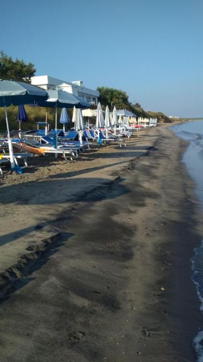 Pláž je od některých bungalovů vzdálenější. Část cesty je po schodech. Pláž na začátku sezóny čistá, moře čisté. Možná v plné sezóně málo lehátek a slunečníků.