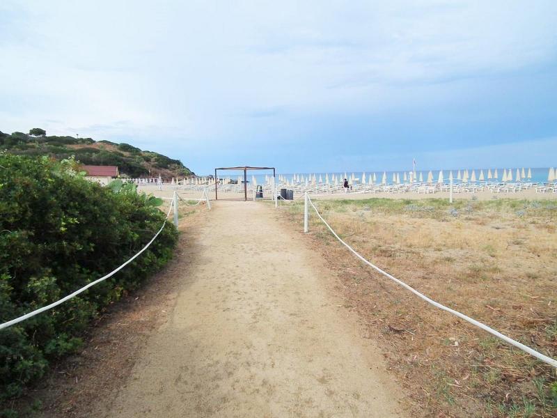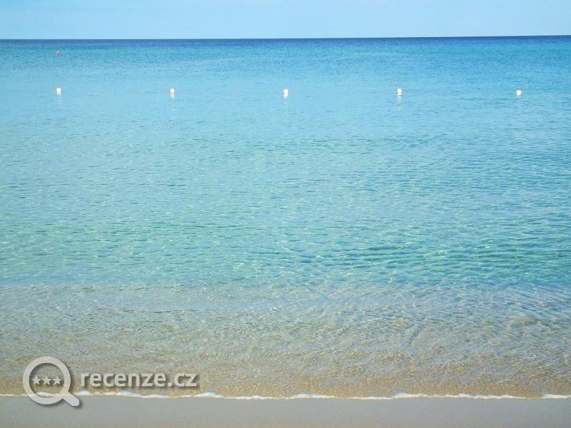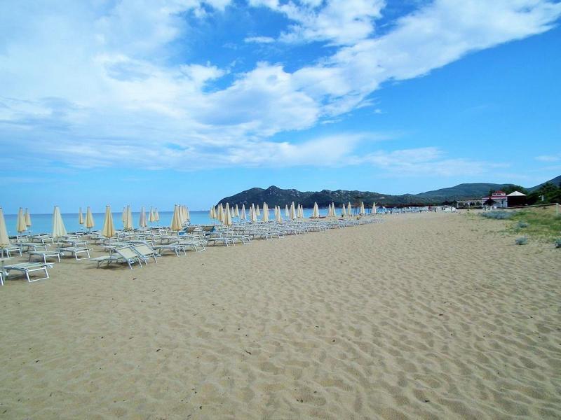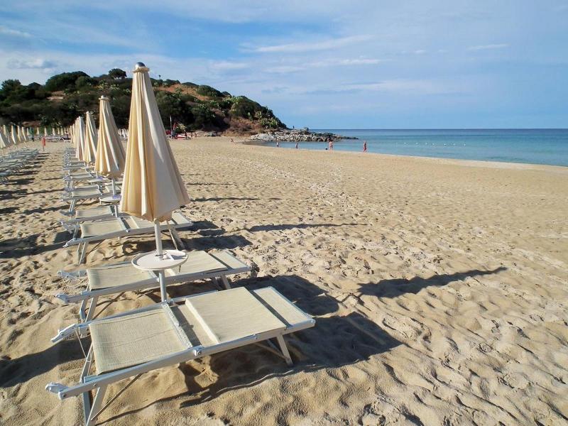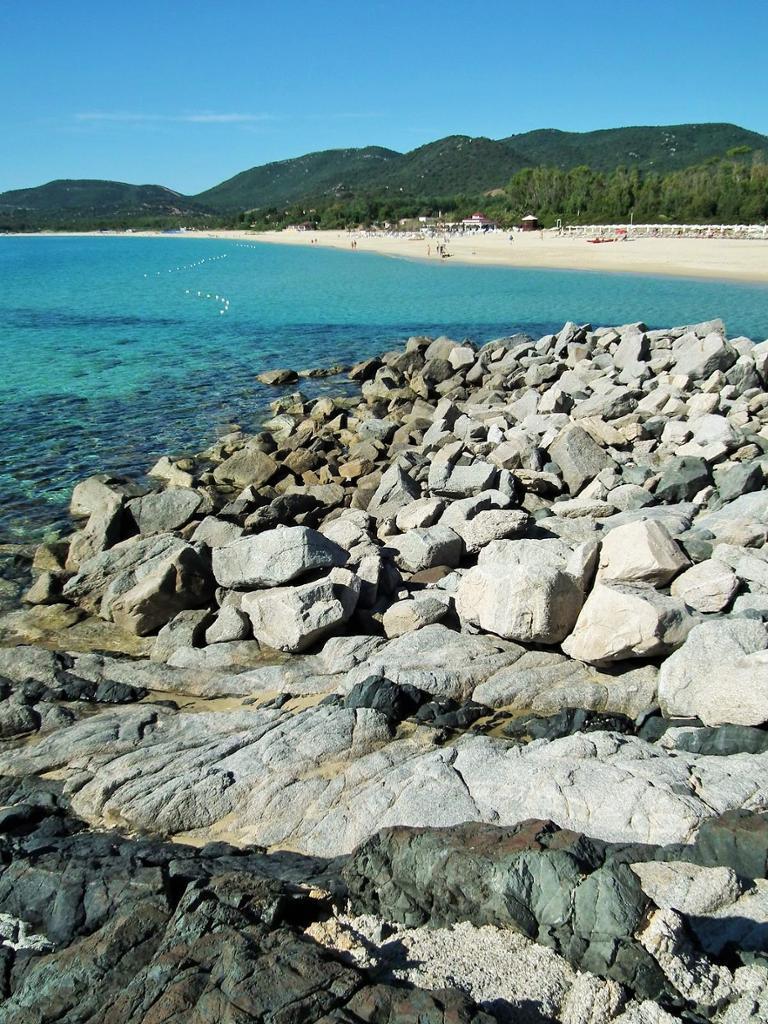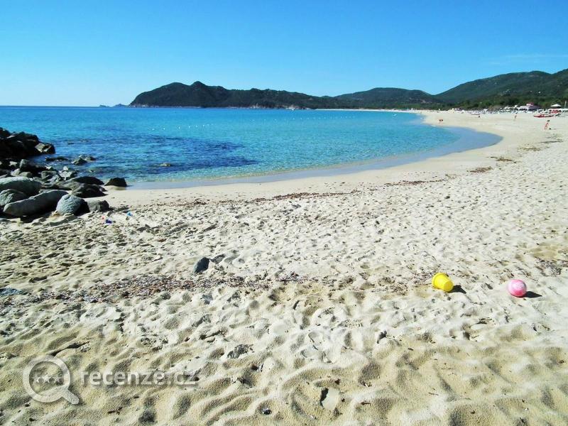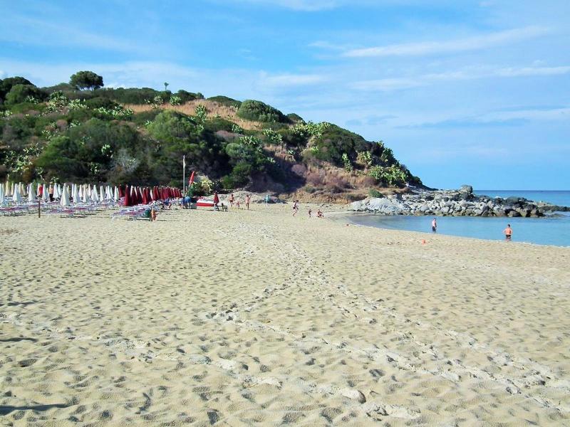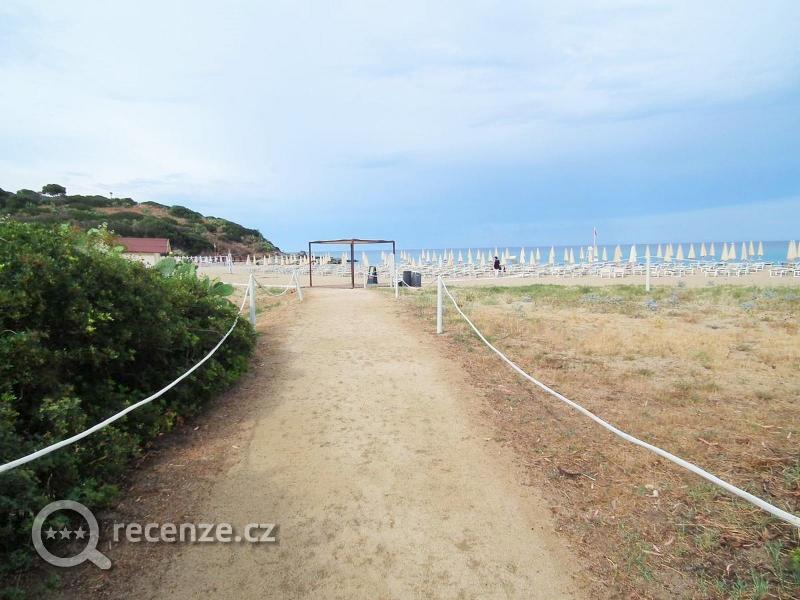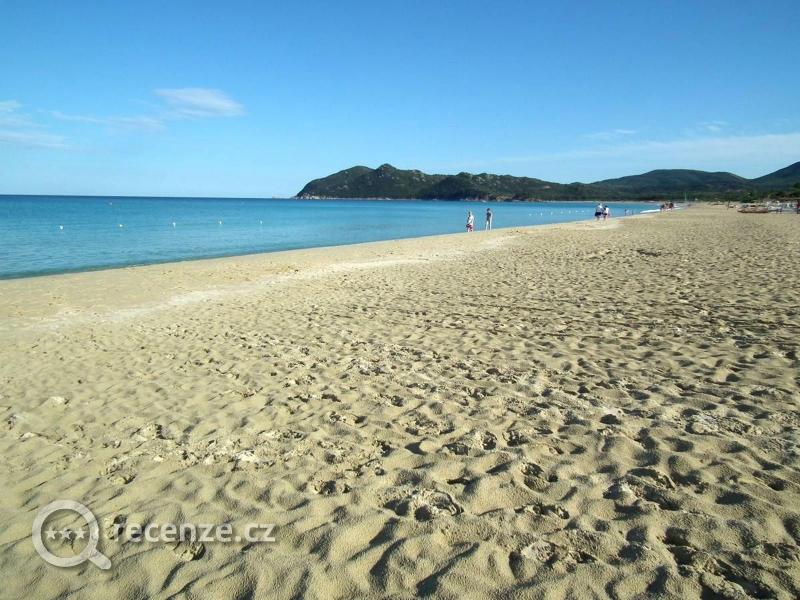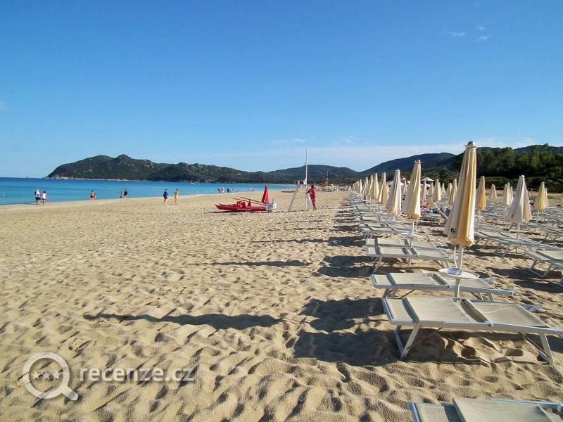 Písčitá prostorná pláž asi 100 m od bazénů, navazuje přímo na zahradu hotelu. Moře bylo krásně čisté, příjemná teplota, vstup do moře pozvolný. Vhodné i pro malé děti či osoby s problémy pohybového aparátu. Lehátka a slunečníky zdarma (mimo 1. a 2. řady ,což je na jihu Sardinie vcelku běžné).