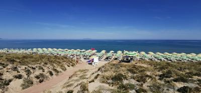 Asi nejlepší z celého pobytu. Prostorná písčitá pláž, oběma směry se dalo chodit stovky metrů na procházky, aniž by člověk zakopával o nohy dalších turistů. Byli jsme tam v první půli června, moře bylo ještě chladnější. První 2 dny klidné, průzračné, další dny vlny a vítr, neb přecházela fronta. Lehátka a slunečníky - mimo první řady - byly v ceně pobytu, tedy zdarma. Plážový bar s WC byl soukromý, tedy zde all inclusive nefungovalo, vše se zde platilo, ale ceny přiměřené. Pláž byla asi 5 minut chůze od hotelu. Vstup do moře také písčitý a pozvolný.
