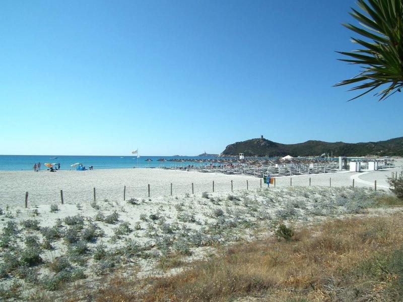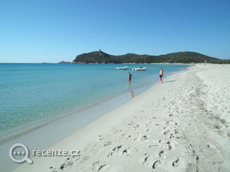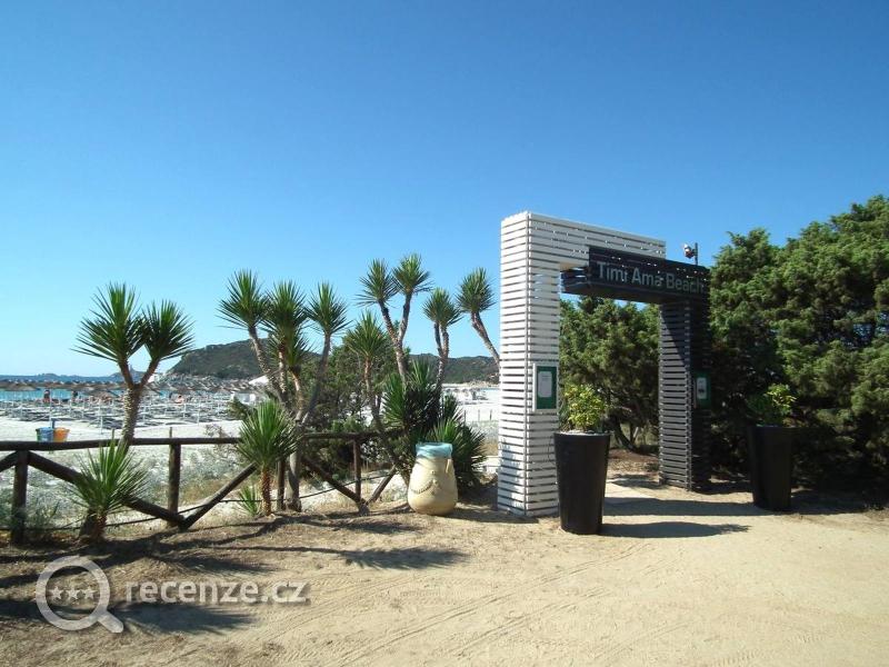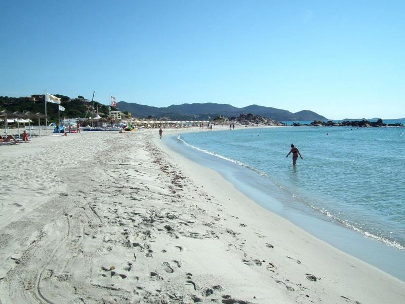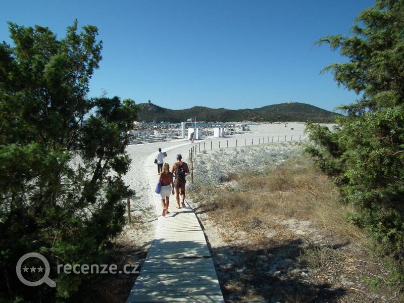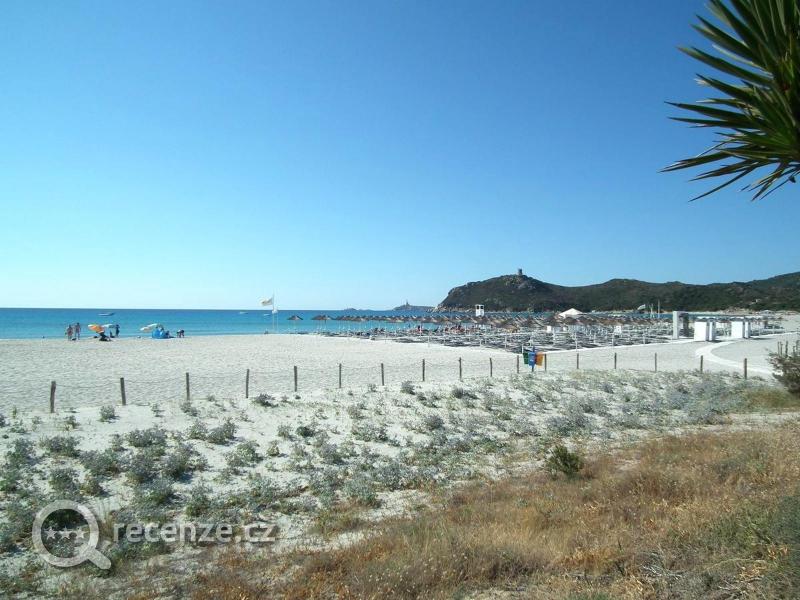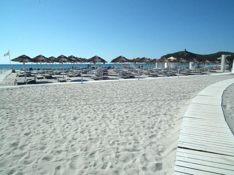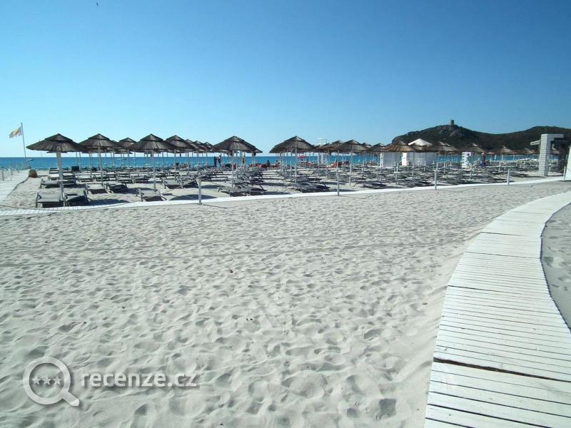 Prostorná privátní pláž s bílým pískem a krásným mořem s pozvolným vstupem je od hotelu oddělena pouze jezerem/lagunou, kolem které se dá dojít cca za 7 minut na pláž. Není tam žádná silnice, je to jen cesta pro pěší. Po cestě můžete pozorovat a fotit plameňáky v laguně. Na pláž vozí hosty tam a zpět elektrický vláček zdarma, interval v sezóně mezi 9. a 18. hodinou cca 7-10 min, později s delšími intervaly. Lehátka, slunečníky a plážové osušky zdarma (kromě 1. a 2.řady - červenec a srpen, které jsou v sezoně za poplatek - to je častý jev na jihu Sardinie). Moc hezká pláž.