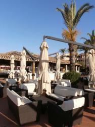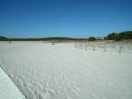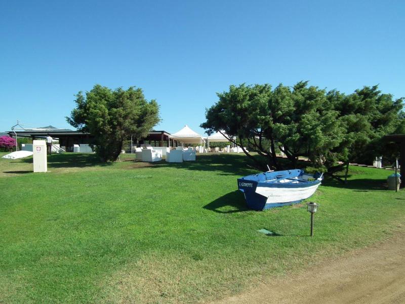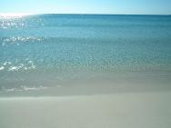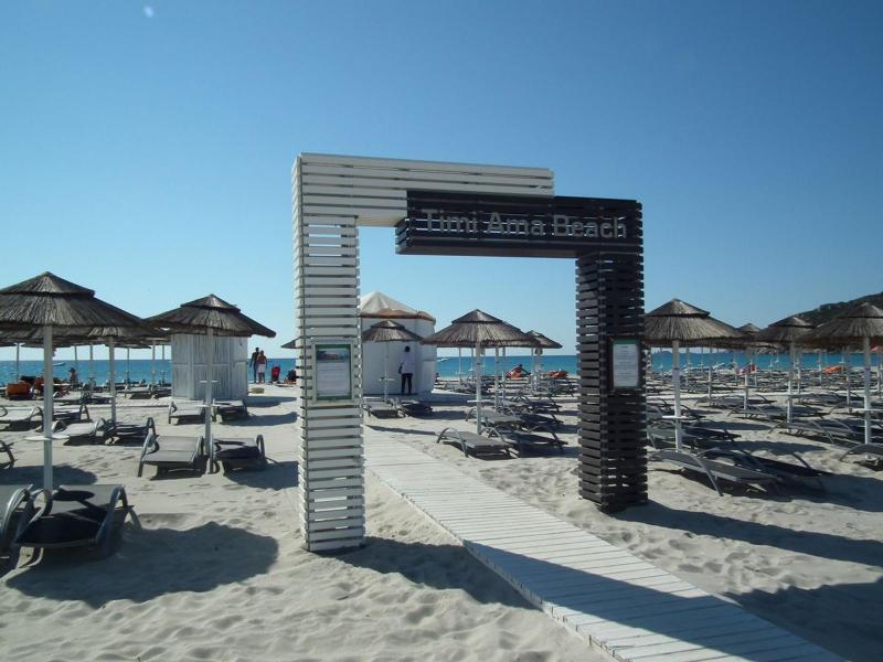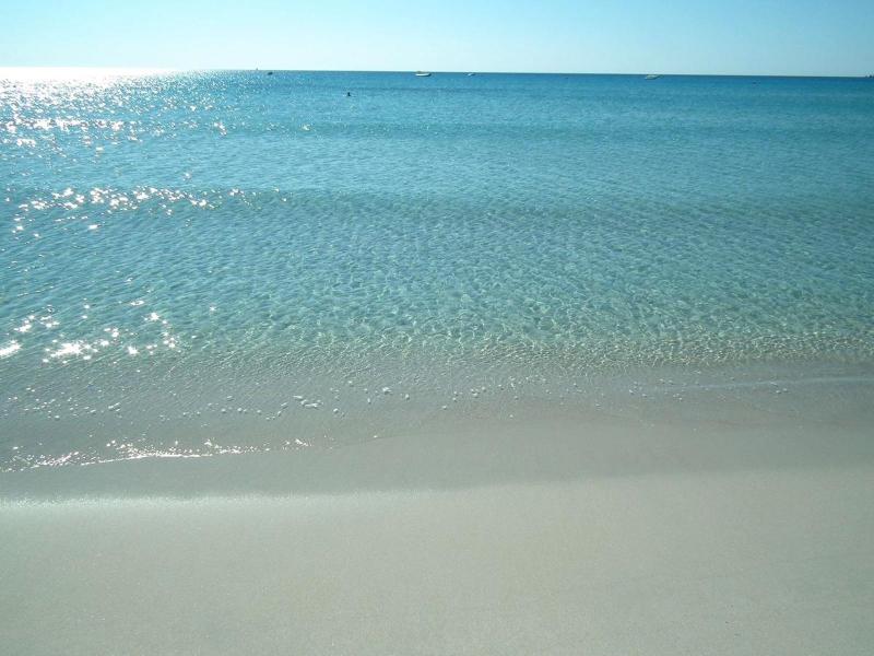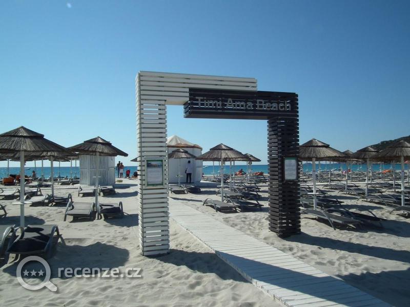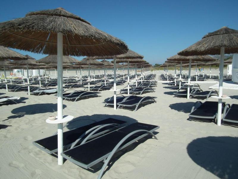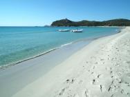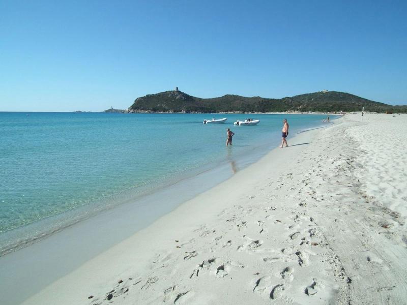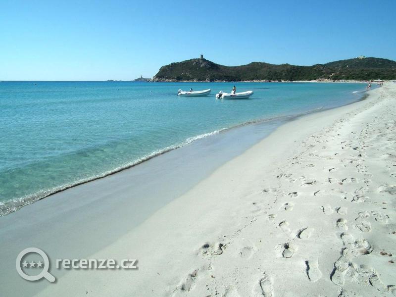 Prostorná privátní pláž s bílým pískem a krásným mořem s pozvolným vstupem je od hotelu oddělena pouze jezerem/lagunou, kolem které se dá dojít cca za 7 minut na pláž. Není tam žádná silnice, je to jen cesta pro pěší. Po cestě můžete pozorovat a fotit plameňáky v laguně. Na pláž vozí hosty tam a zpět elektrický vláček zdarma, interval v sezóně mezi 9. a 18. hodinou cca 7-10 min, později s delšími intervaly. Lehátka, slunečníky a plážové osušky zdarma (kromě 1. a 2.řady - červenec a srpen, které jsou v sezoně za poplatek - to je častý jev na jihu Sardinie). Moc hezká pláž.