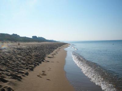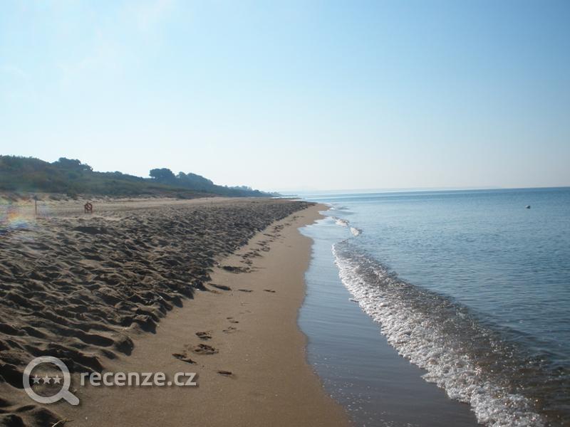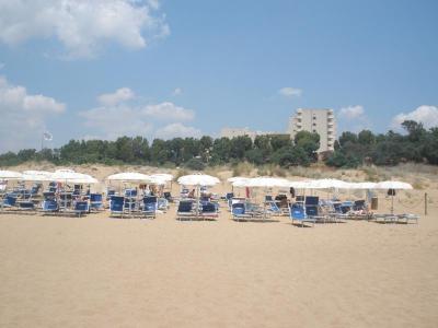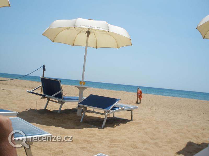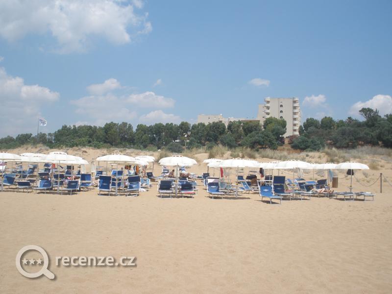Pláž je cca 200 m od hotelu, cesta k pláži je mírně z kopce, místy schody. Vše je v areálu hotelu, takže k pláži jezdí i vozítko, ale pěšky je to max. 2 minutky. Na pláži jsou lehátka a slunečníky zdarma pro cca 150 lidí. Nebyl žádný ranní boj o lehátka. Dopoledne se pláž zaplní, kolem 13 italové odejdou na siestu a na pláži zůstanou pouze češi, nás tam bylo tak kolem 10 a měli jsme celou pláž i moře jen pro sebe. Na pláži je stánek s pitím a nanuky. Dají se půjčit šlapadla, loďky, surf, vše za poplatek.