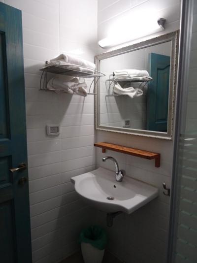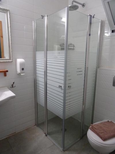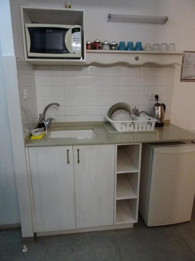 Pěkný pokoj s klimatizací (kterou jsme používali jako topení) a s kuchyňským koutem, mikrovlnnou troubou, lednicí a televizí. Dále byl k dispozici set pro přípravu čaje a kávy a vysoušeč vlasů. Každý pokoj měl k dispozici před pokojem dřevěné posezení.