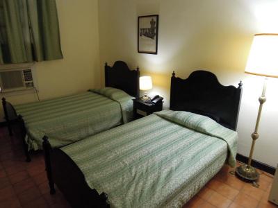 První pokoj, ve kterém jsme nocovali, byl standardně zařízen, avšak působil vybydleným a ne příliš útulným dojmem. Koupelna byla v horším stavu, jako delší dobu špatně udržovaná, a dveře šly špatně zavírat. Vybavení pokoje obsahovalo 2 oddělené postele s nočními stolky, minibar, individuální klimatizaci, velkou šatní skříň s trezorem, satelitní TV, telefon, fén. K dispozici byly náhradní polštáře a deky. Nacházel se ve 3. patře hotelu a musím podotknout, že do něj doléhal silný hluk provozu aut od brzkých ranních do pozdních nočních hodin. Bylo to však dáno především právě polohou hotelu, což pro nás bylo výhodou. Druhý pokoj, do kterého nás ubytovali po návratu z Viňales, byl umístěn ve 4. patře. Byl očividně nově vymalován a celkově na vyšší úrovni. I koupelna byla v dobrém stavu, dveře se však opět špatně zavíraly. Do tohoto pokoje již nedoléhal žádný hluk z ulice, přesto, že byl situován na stejnou stranu jako předchozí, pouze byl o patro výš. Oba pokoje, které jsme obývali, byly bez balkonu. Napájení v tomto hotelu bylo 110V/60Hz.