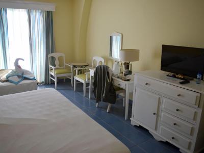 Centrální klima s vlastním ovládáním, ale pouze cool režim, při příchodu z neznámých důvodů nastaven plný tah na 15°C /venku pouze 20°/, při dlouhodobějším vypnutí jsou mírně, ale stále, cítit odpady, takže pokojská to zase zapne... Pro oblečení vestavná skříň s málo policemi, ale dost ramínky, žehlička + prkno, dříve obvyklý deštník nikoliv. Tresor za poplatek (? nevím, po zaplacení několika výletů mi již za to nestál - pokojské si ochotně odeberou zanechaný bakšiš (nebo jakékoliv drobné dárečky - ocení i obyčejnou zubní pastu či laciné "šminky" - na stolku či posteli, tu skříň téměř jistě neotvírali a stejně tak šuple nočního stolku).