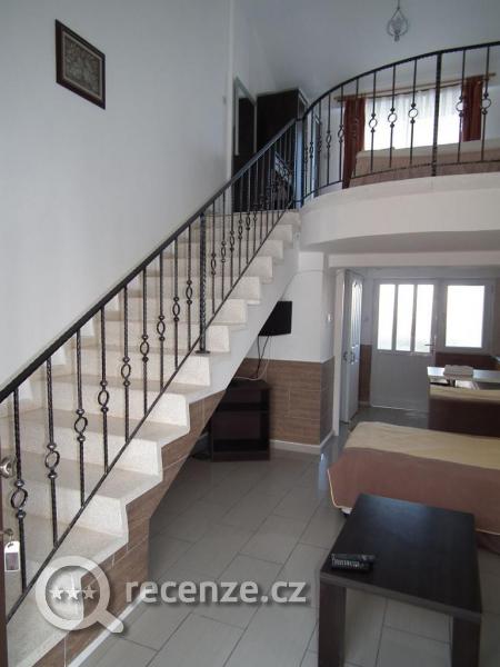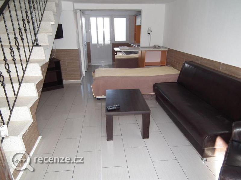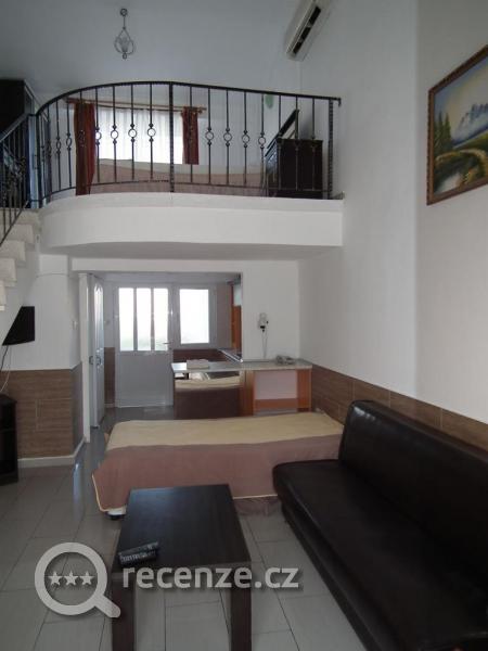 Bungalovy jsem viděla 2 typy. Dvoupatrové, kde jsou nad sebou 2 studia, jedno v přízemí a jedno v patře, do kterého se dostanete venkovním schodištěm. My jsme bydleli v patrových bungalovech s jedním studiem. V přízemí bungalovu prostorná obývací místnost s koženkovou sedačkou, stolkem jednou postelí a TV + kuchyňka - zcela nezařízená, koupelna se sprchovým koutem. Po schodech nahoru spací patro s dvěma lůžky, šatní skříní, zrcadlem, stolkem a balkonem, který směroval do okolní výstavby. Bungalov velmi prostorný, jednoduše, ale účelně vybavený, ale všude vidíte "tureckou práci" - na detaily nehledí, což je znát v mnoha ohledech. Ručníky a osušky v koupelně vyměňovali denně, ovšem jejich barva a kvalita materiálu nic moc. Na 3* hotel však velmi dobré. Voda z vodovodu teče mírně slaná. Vodu na pití bylo možné čerpat v restauraci nebo na barech celý den. Na pokojích jsou britské zásuvky, adaptér se dal půjčit na recepci za 2 EUR/pobyt. My jsme ale na pokoji jeden adaptér našli, přes který byla zapojena TV, takže jsme využívali ten a nemuseli si nic půjčovat.
