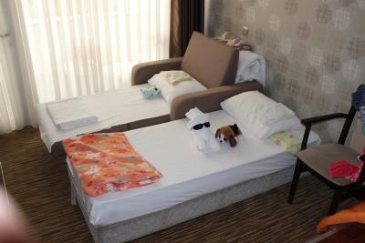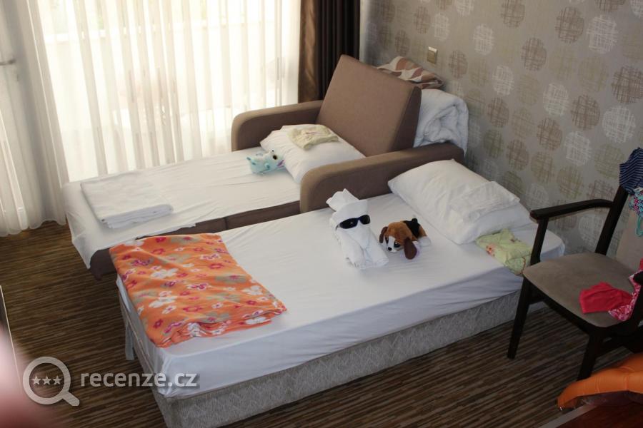 Dovolená je taková jakou si ji uděláte, bydleli jsme rovněž ve vilce, již v Čechách jsme upozornili cestovku, že nehodláme řešit ubytování a očekáváme to, co jsme objednali a uhradili. Mohu říci, že jsme měli jeden z nejlepších pokojů ve vilce, jaký lze získat, ne co do vybavení, ale do polohy - klid, stín. Pokoj je skromně a účelově velmi dobře vybaven, děti spaly na přistýlkách, opět vše jak má být. Náš příjezd na hotel byl v 03.15 hodin ráno ! Do 5-ti minut jsme měli karty od pokoje, na rukou náramky pro ultra all inclusive, do pokoje nám byli personálem dovezena zavazadla a v tuto brzkou ranní hodinu jsme měli všichni příchozí otevřenou jídelnu s večeří a nápoji, včetně kávy, polévky, koláčků, ovoce apod. Mezipřistání v Turecku, tam i zpět, asi jsme měli štěstí, ale do 50-ti minut jsme byli pryč, vody a pití v letadle dostatek, při cestě zpět jsem tak výbornou večeři nečekal - zeleninový salát, bagetka s máslem + plnohodnotná večeře - těstoviny s kuřecím masem - 2 ks.