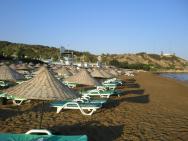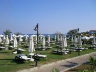 Moc pěkná a prostorná písečná pláž s lehátky a slunečníky zdarma na trávě i na písku je přímo u areálu.