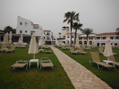 Před hotelem je velká travnatá plocha s lehátky a slunečníky, a malý oblázkový vstup do moře. To je dáno skalnatým břehem. Písčitá pláž bez kamenů je zhruba 15 minut pěšky směrem na Paphos.